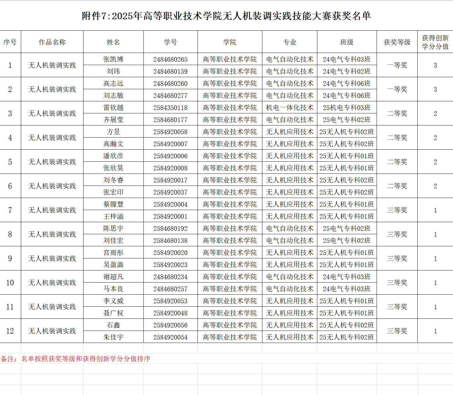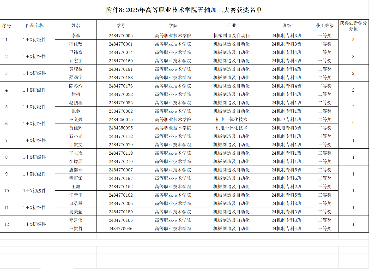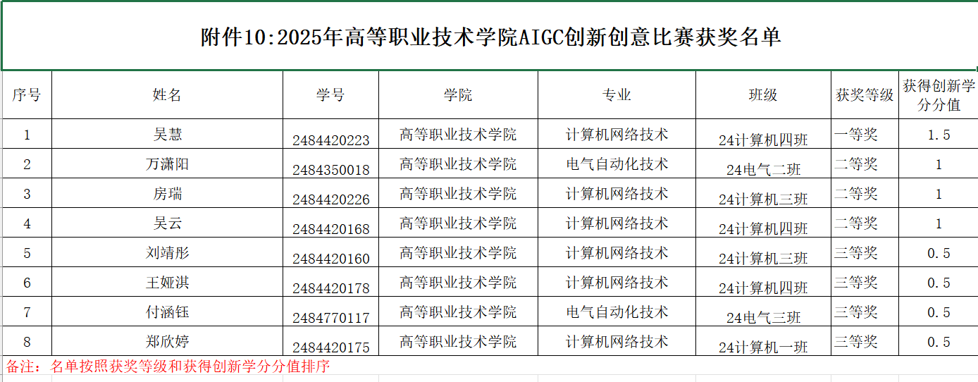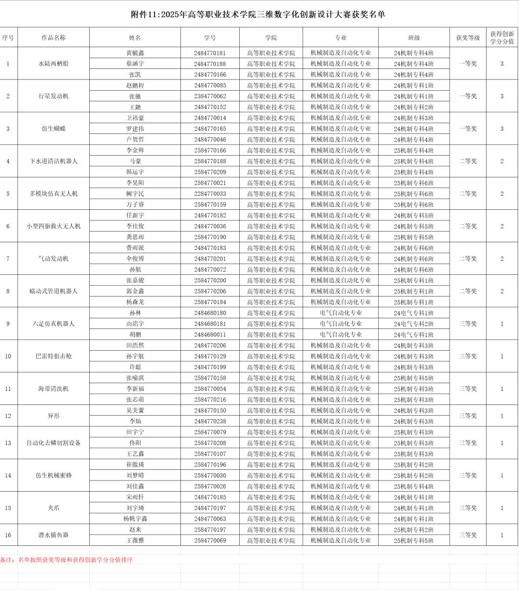 现将本年度主要赛事获奖名单及相关信息予以公示,具体获奖详情详见附件《2025年工业机器人操作大赛-学生获奖名单》《2025年广告短视频大赛-学生获奖名单》《2025年电气CAD制图大赛-学生获奖名单》《2025年股票模拟大赛-学生获奖名单》《2025年五轴数控加工大赛-学生获奖名单》《2025年网络设备运维大赛-学生获奖名单》《2025年业财税信息处理技能大赛-学生获奖名单》《2025年浪潮机电一体化系统创新仿真挑战赛-学生获奖名单》《2025年无人机装调实践技能大赛-学生获奖名单》《2025年中俄AIGC创新创意技能大赛-学生获奖名单》《2025年中俄三维数字创新设计大赛-学生获奖名单》。