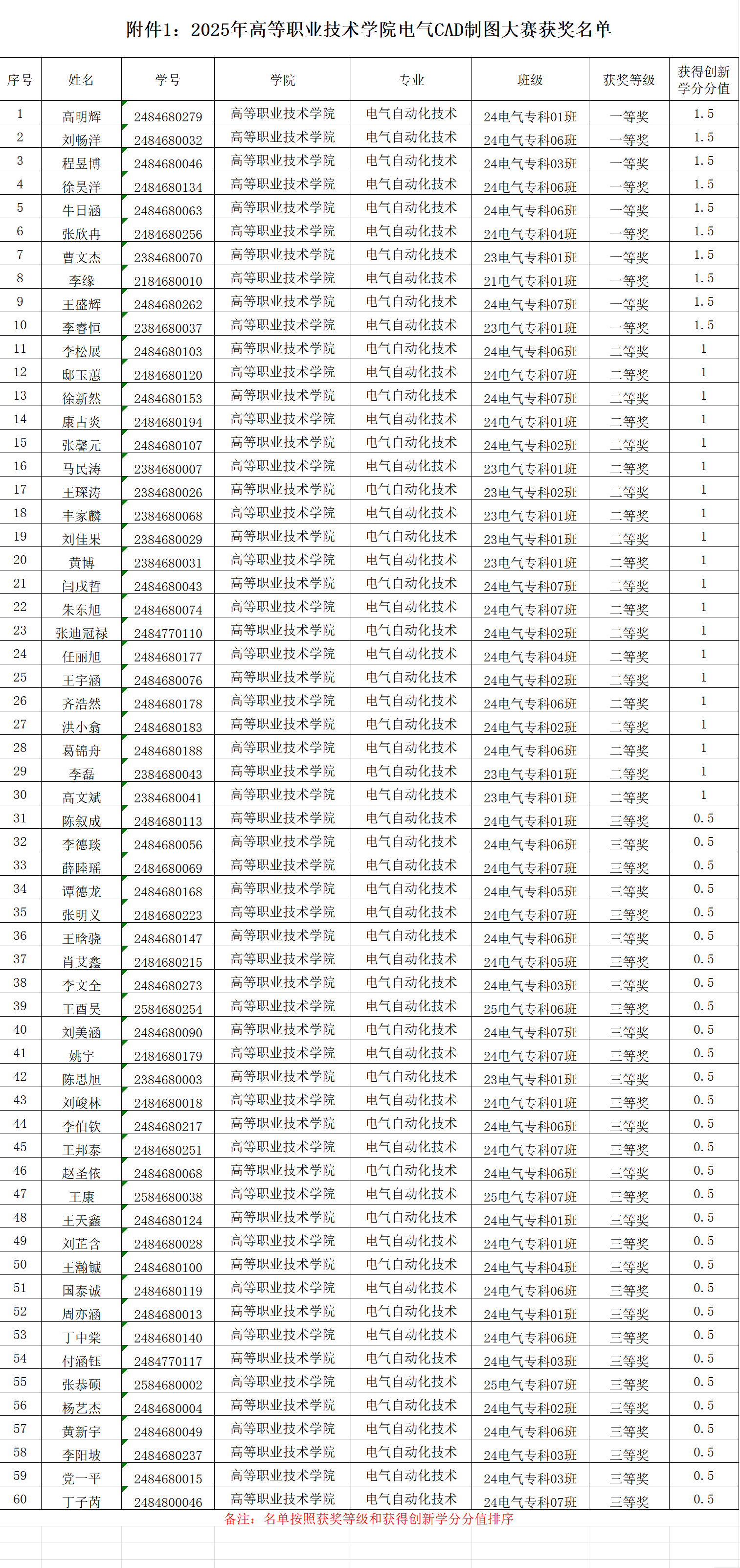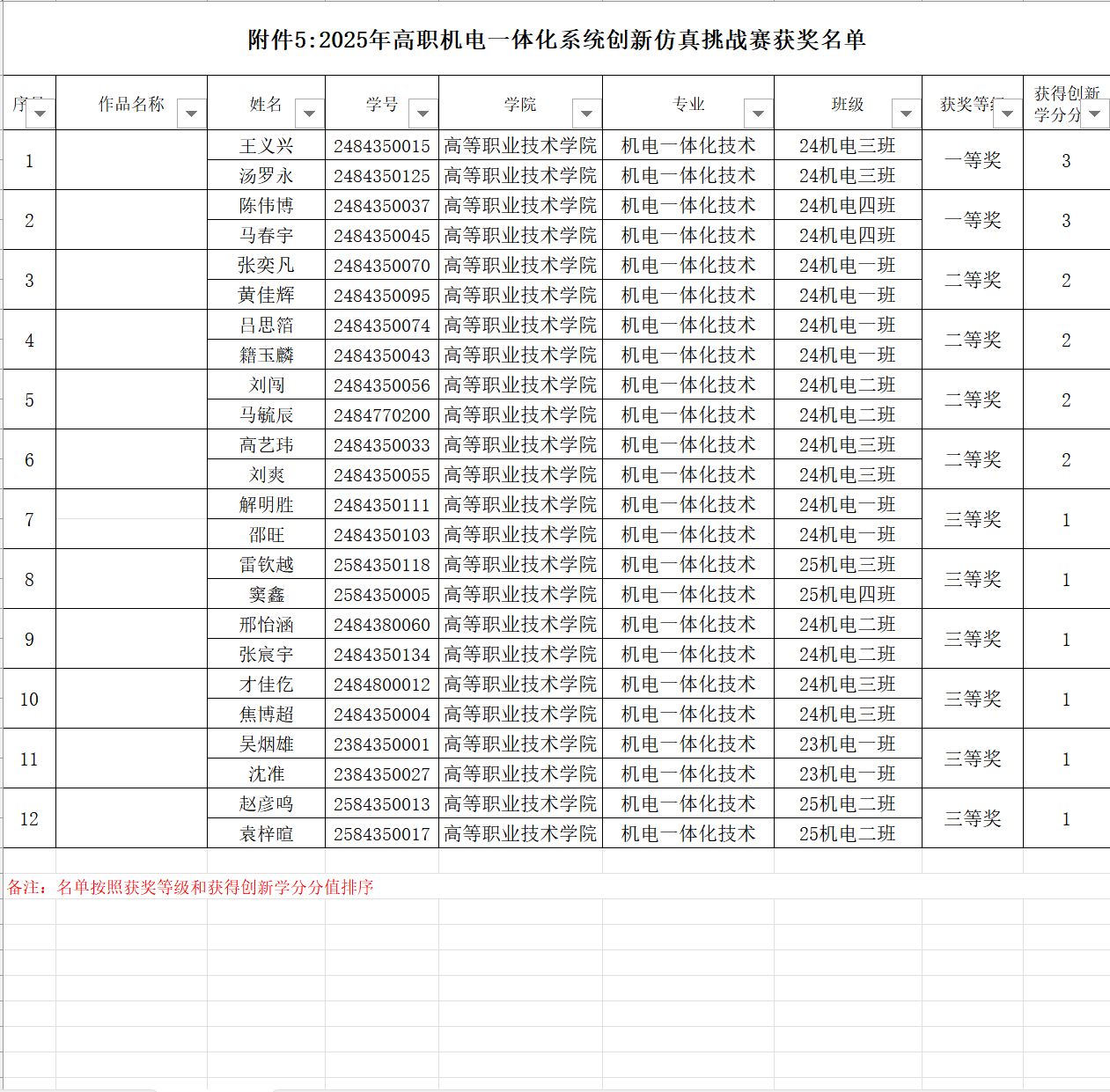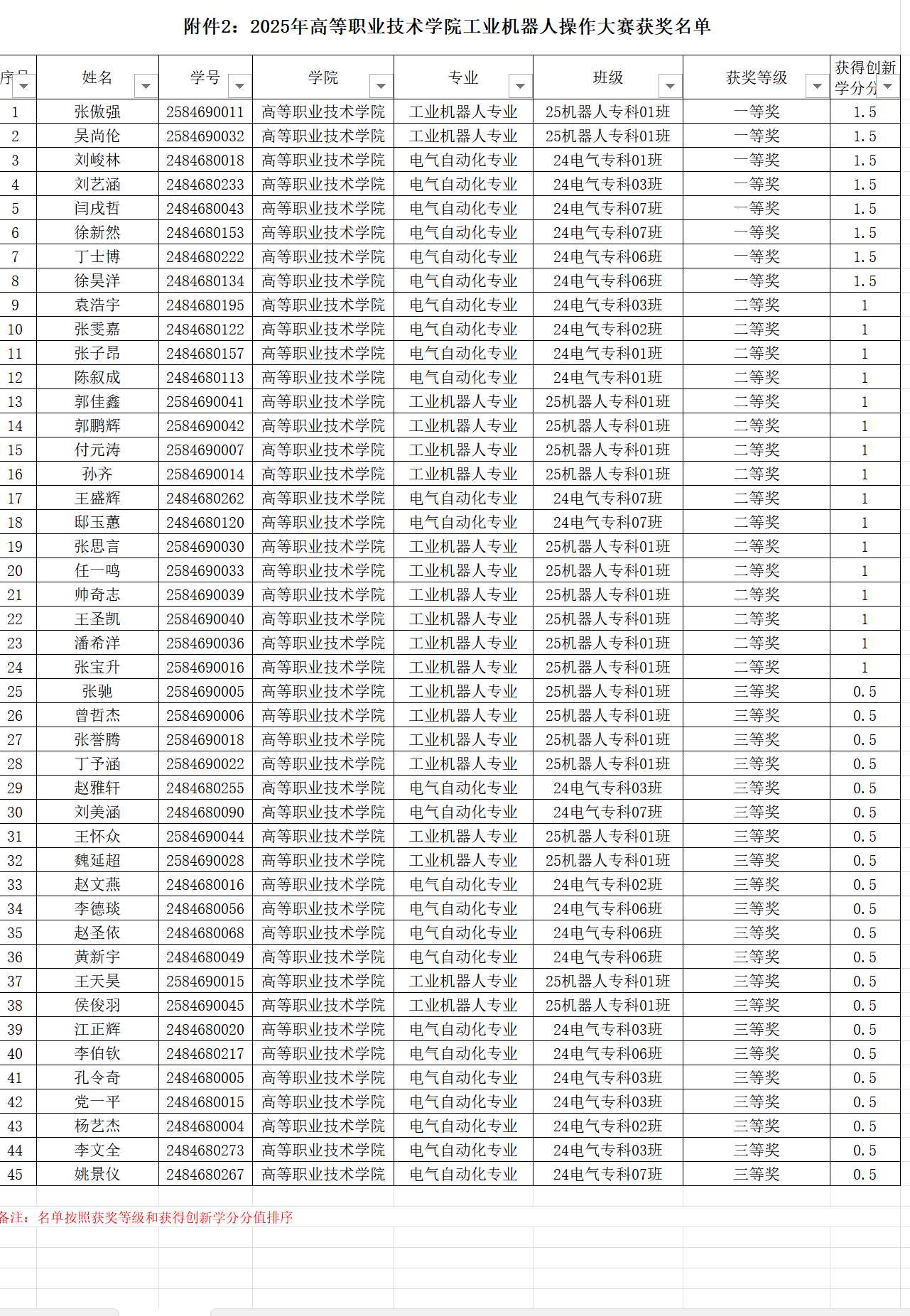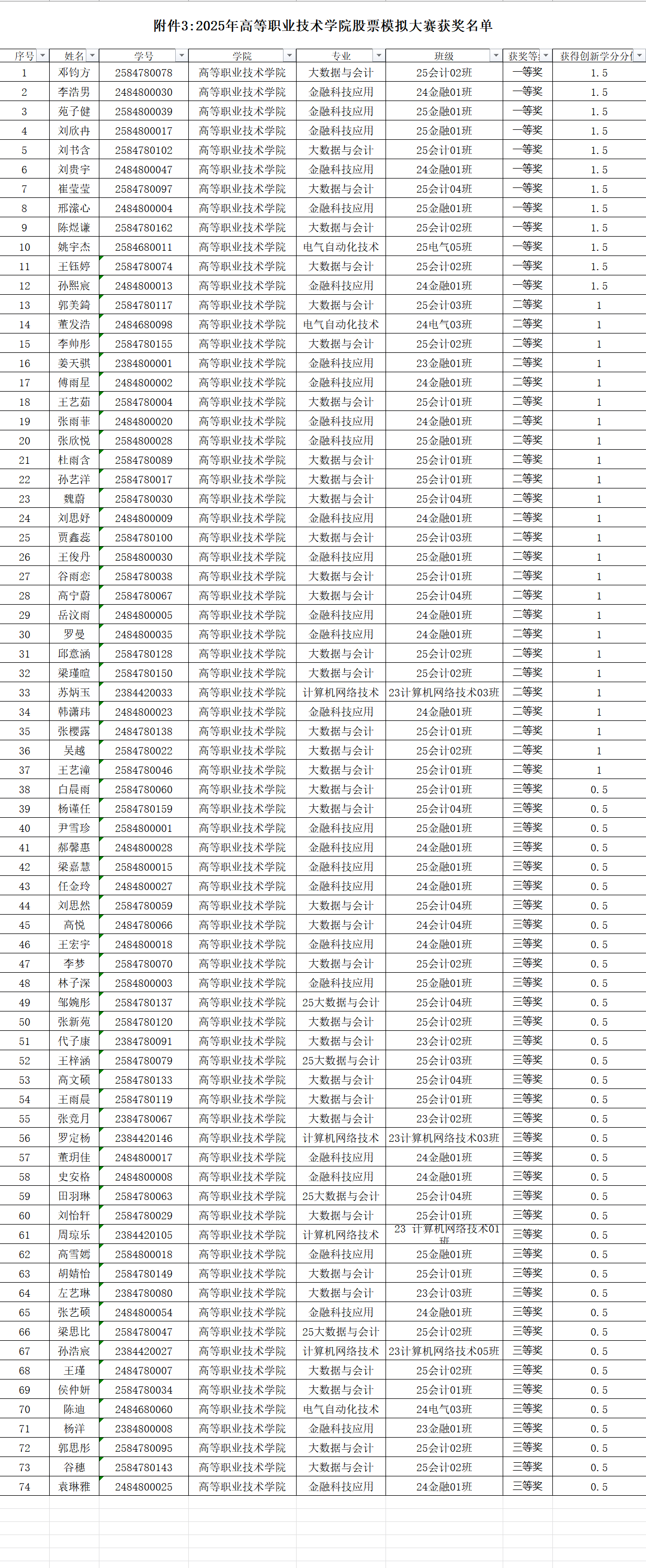 现将本年度主要赛事获奖名单及相关信息予以公示,具体获奖详情详见附件《2025年工业机器人操作大赛-学生获奖名单》《2025年广告短视频大赛-学生获奖名单》《2025年电气CAD制图大赛-学生获奖名单》《2025年股票模拟大赛-学生获奖名单》《2025年五轴数控加工大赛-学生获奖名单》《2025年网络设备运维大赛-学生获奖名单》《2025年业财税信息处理技能大赛-学生获奖名单》《2025年浪潮机电一体化系统创新仿真挑战赛-学生获奖名单》《2025年无人机装调实践技能大赛-学生获奖名单》《2025年中俄AIGC创新创意技能大赛-学生获奖名单》《2025年中俄三维数字创新设计大赛-学生获奖名单》。