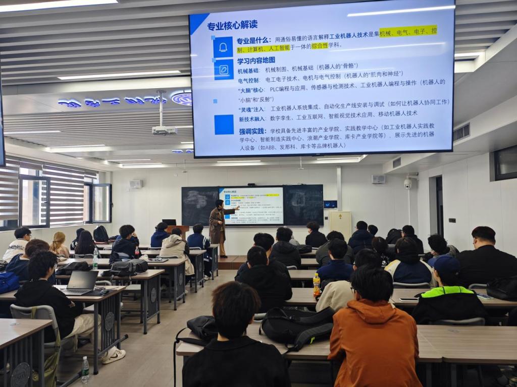 会上,周老师紧扣学校通知要求,以专业培养目标、课程体系、实践环节、毕业要求以及学习建议为核心框架,立足工业机器人技术专业特色与智能制造行业发展需求,开展系统全面的讲解。围绕学校明确的解读重点,逐一梳理专业培养定位与毕业标准,清晰阐释公共基础课、专业基础课、专业核心课的设置逻辑与衔接关系,使学生充分理解各门课程在专业能力培养中的作用,明确学习重点与进阶路径。同时,详细介绍了我校产业学院与实践教学中心的优质资源,突出实践教学平台与真实工业场景高度契合的优势,强调专业建设紧密对接产业需求、岗位需求与就业需求,将产业学院资源与学生就业岗位、职业发展、薪资待遇紧密结合,深入阐释专业特色、培养优势与就业竞争力,进一步坚定学生专业学习信心。